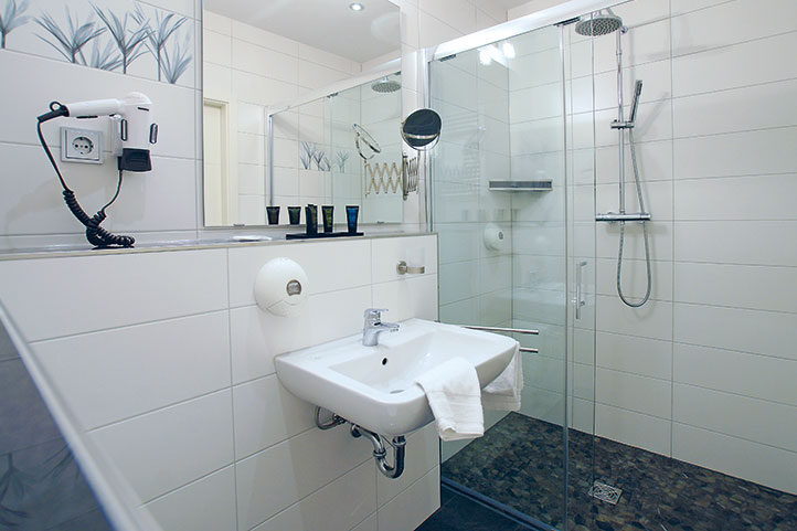 - Regenwalddusche oder Badewanne, WC, Fön
