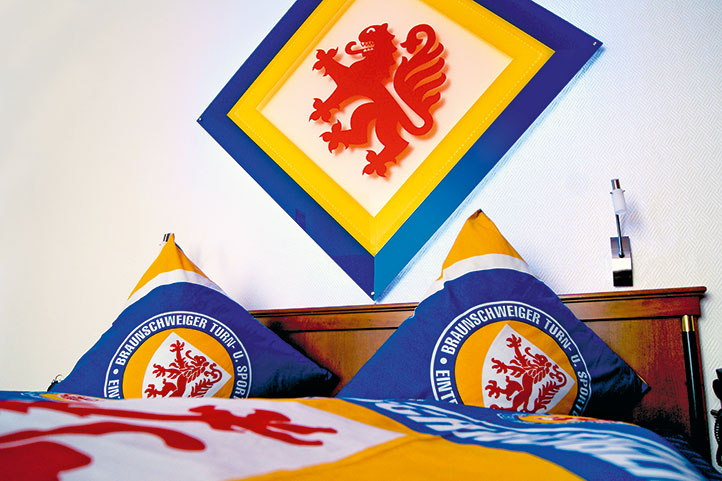 Das Eintracht-Zimmer mit der Zimmernummer 67 hat einen einzigartigen Blick auf den Braunschweiger Löwen. Das Zimmer schmücken zusätzlich zahlreiche Fanartikel und Unikate rund um den niedersächsischen Traditionsverein.
