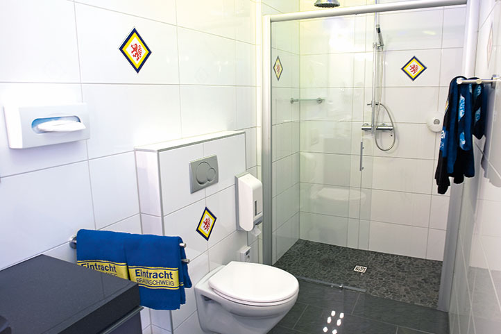Nein, es erwartet Sie auch ein illuminierter knapp 2 Meter großer roter Löwe über dem Bett, eine kleine bildliche Zeitreise durch die Geschichte des Vereins und Vieles andere. Das Badezimmer verzaubert durch seinen ganz eigenen Charme mit Eintracht-Fliesen, Regenwalddusche und einer einzigartigen blau-gelben Lichtinstallation.
